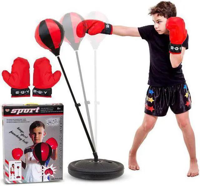 AZToys 777-777 adjustable punching bag with stand is great boxing set for kids aged 3 to 8 years. It includes a height-adjustable stainless steel tube stand, pumped punching ball made of high-quality PU leather, durable strong spring, a sturdy base that can be weighted by water or sand, a free pump, and boxing gloves. The strong spring which connects to the round base allows the punching ball bounce back and forth in 360o directions. This boxing set can improve balance, improve hand-eye coordination, strengthen upper body coordination, improves alertness, and help vent out anger. It keeps your kids more focused.