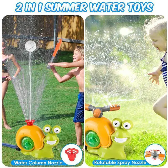 Complete Water Sprinkler Toy Kit:Bring our water sprinkler baseball toy home to create lasting memories of laughter-filled days spent under the sun. Package includes 1x snail shaped water sprinkler toy,1x retractable baseball bat,4x baseballs,1x ground stake,1x rotatable spray nozzle,1x water column nozzle,1x 1/2 faucet connector.