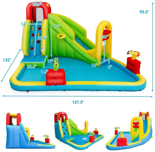 Quick Inflation & Deflation: This water park takes only a few minutes to inflate, and it also can be quickly deflated through a long and short air outlet tube. The whole process is quick and easy, so your children dont have to wait too long to start having fun! It is suitable for a yard, park, lawn, and other places. (Recommended use with 680W blower, the blower is not included.)