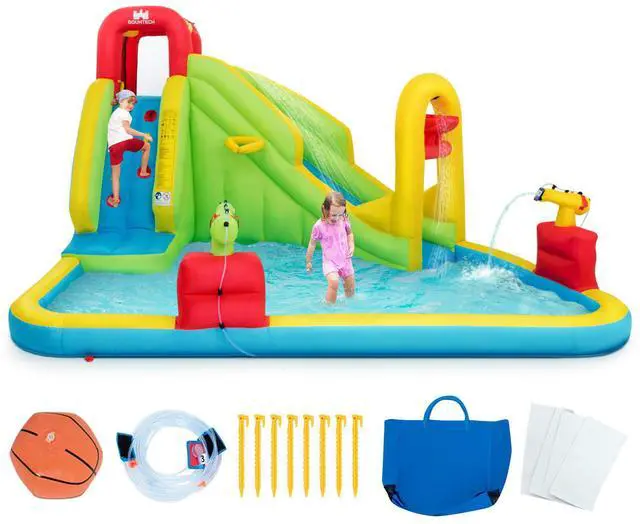 Multiple Play Areas: This inflatable water park combines a variety of functions and entertainment. It comes with a long slide, a climbing wall, a splash pool, and a basketball rim. Children can enjoy the fun of various games at the same time. It gives children a happy childhood! (Suggestion: every kid's weight should be under 116 lbs.). It is suitable for three kids to play together. It is recommended for 3-10 years old children.