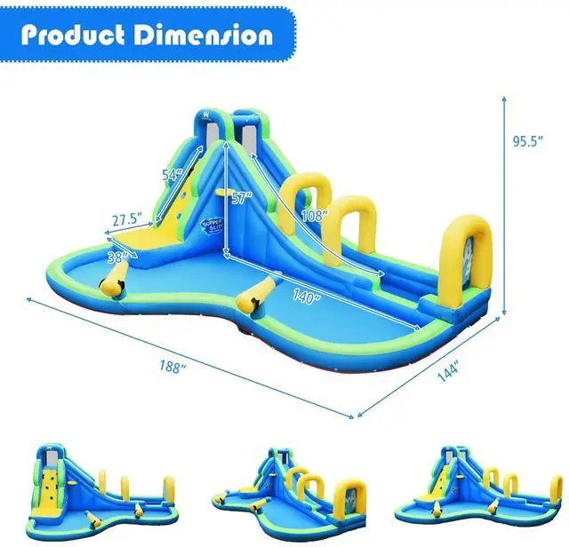 -Includes water slide, climbing wall, built-in basketball rim, splash pool and water cannons for multiple fun