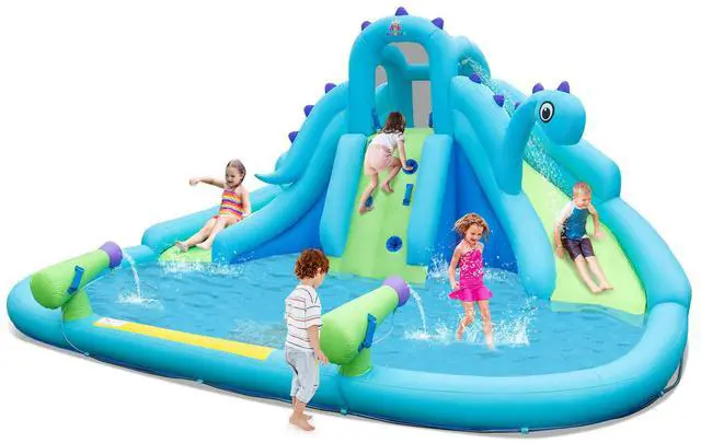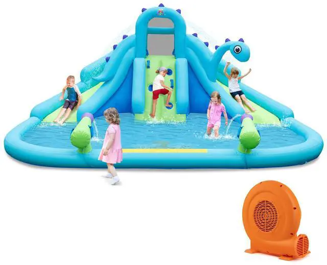 Includes: 1 x Water Slide 1 x Water Hose Kits 1 x Repair Kits 12 x Ground Stakes 1 x 584W Blower 1 x Carry Bag 1 x User Guide Dual long slides and climbing wall for more funDual water cannons and a large splash pool for summerMade of 420D Oxford cloth that is tear-proof and wear-proofFeatures dense mesh fabric walls that are long-lastingDesigned with elevated handrails for high securityExquisite double seamless stitches make it enduringWet status for outdoors ensures splash and slide funDry status for indoors allows kids to run climb and slideASTM compliant and CPSIA certificated for ensured qualityEasy to install thanks to clear instructionsComes with a powerful blower for quick setup