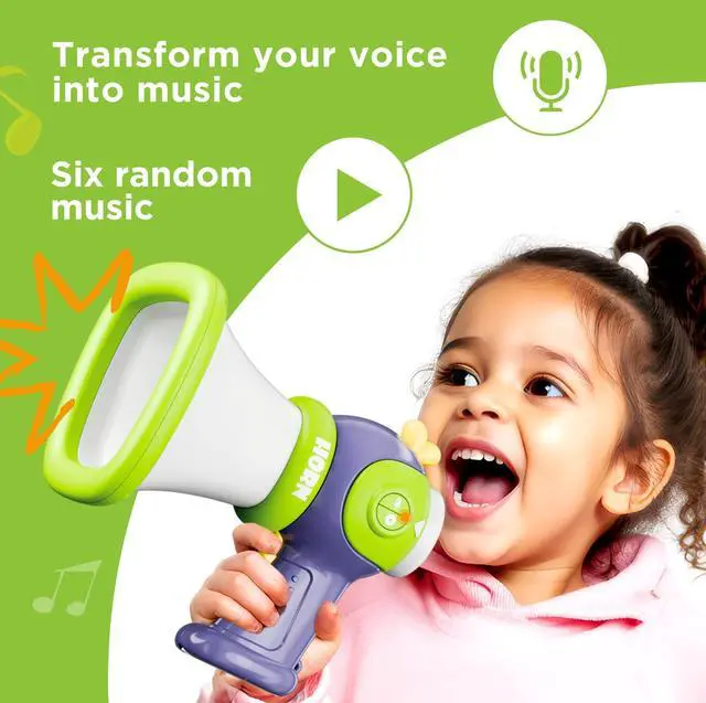 6 Random Music Generator A standout feature that sets this toy apart! Simply speak or laugh into the mehaphone, and it will instantly generate 6 different background melodies based on the input. Make the game time more enjoyable.