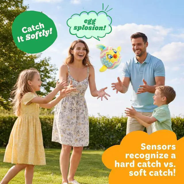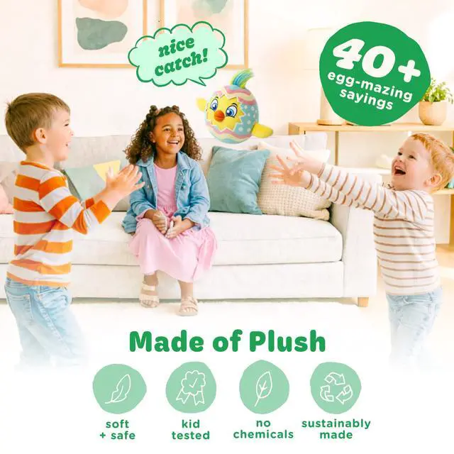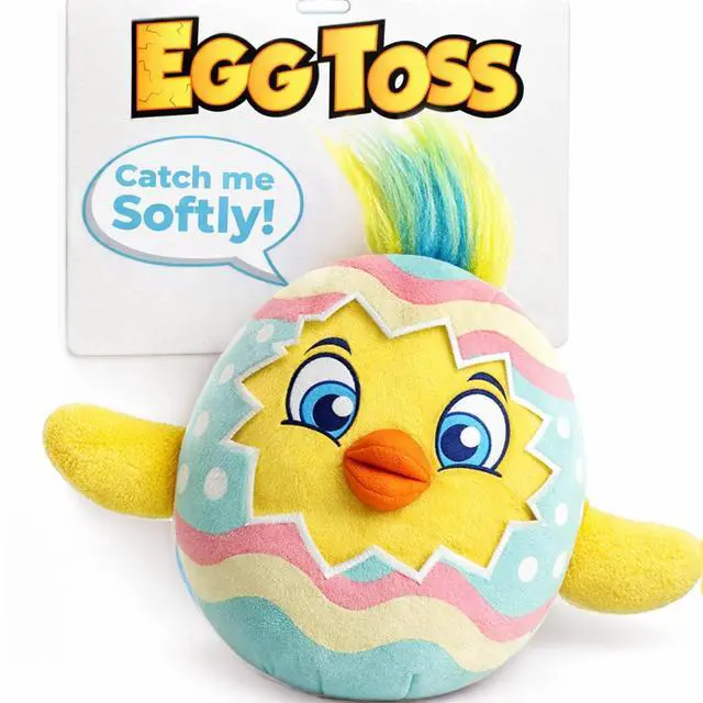 Egg toss is the perfect birthday game for kids! This stuffed animal has over 50 egg-mazing phrases, sounds, and music. Pass the toy and catch it softly. The egg will recognize and respond when you catch it too hard and crack the egg. Take a step back when you get an Egg-Mazing Catch. This kids game can be used indoor and outdoor making it a great gift year round. Includes volume control and comes with 3x AAA batteries. The plush is machine-washable if you remove the sound box first.