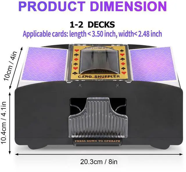 Dimensions in inches: 8.07''(L) x 3.74''(W) x 3.54''(H).Lightweight and portable,holds up to 2 decks of cards at one time.Requires 4 AA batteries (not included).Poker cards are not included
