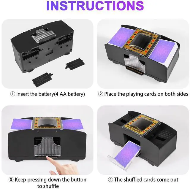 Easy to use - Firstly,insert 4 AA batteriesNext,put your card into two feed ; Then,keep pressing the buttton to shuffle ; Last,take out the shuffled card to enjoy your card game