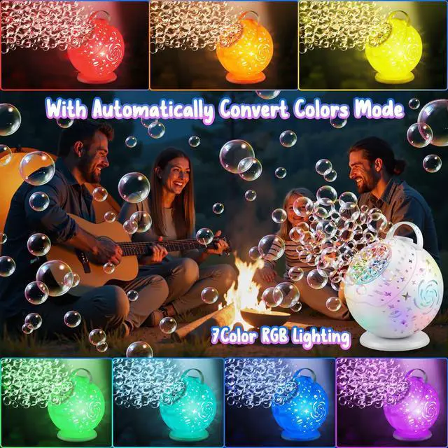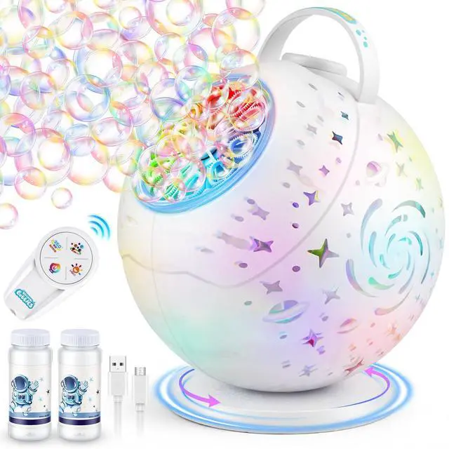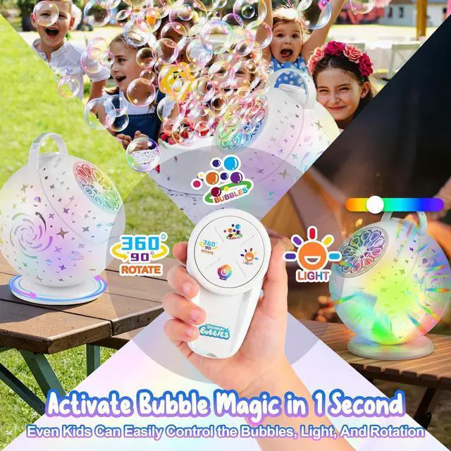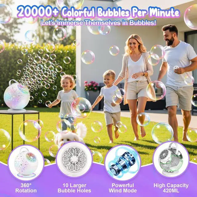 [20000+Bubbles/MinNonstop Party Fun] Enjoy this bubble machine for kids! This automatic bubble machine produces over 20,000 colorful bubbles per minute with 10 larger holes and a powerful motor. The 360° rotation provides full coverage for parties, weddings, and birthdays perfect as an outdoor bubble maker.