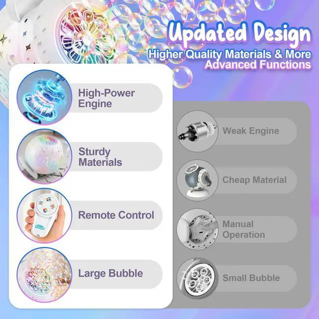 [Upgraded Design: Rechargeable & Child-Safe Certified] This bubble toy is made with a high-power engine and sturdy ABS material for long-lasting use. This upgraded, rechargeable bubble machine now features remote control for easy operation and produces larger bubbles, with CPC & ASTM certification for added safety.