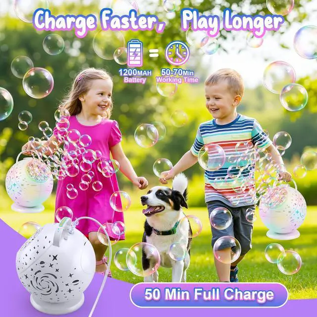 [70 Min Playtime & Fast USB-C Charging] Play longer, charge faster! This bubble machine for toddlers features a 1200mAh rechargeable battery that provides 50-70 minutes of continuous play. Fully charges in 50 minutes via USB-C. Enjoy long-lasting bubble fun with convenient and efficient charging!