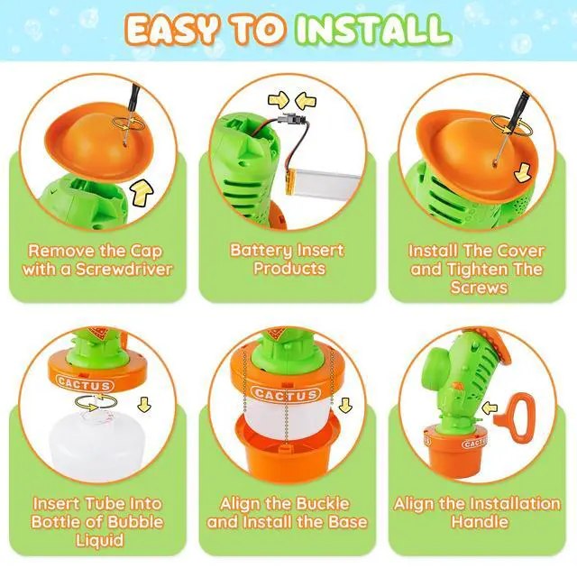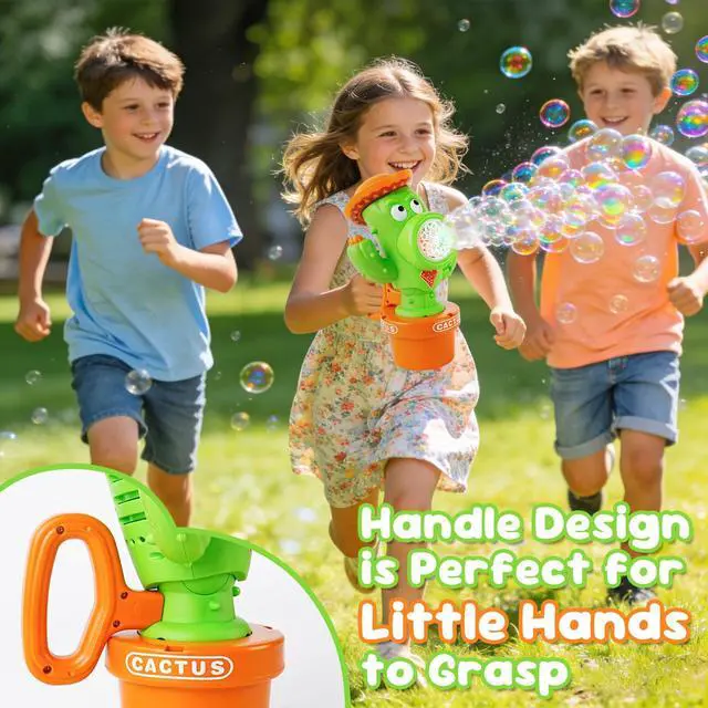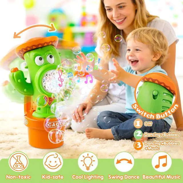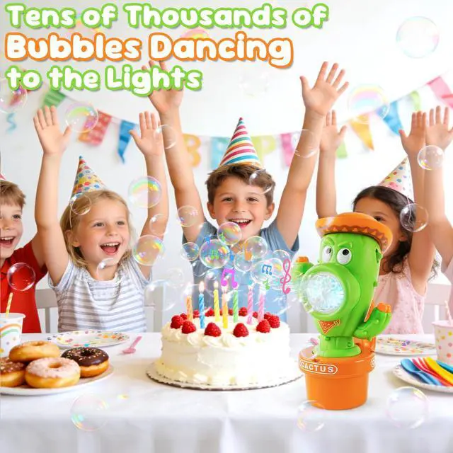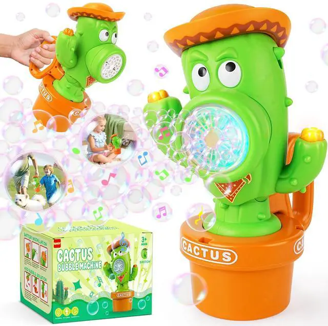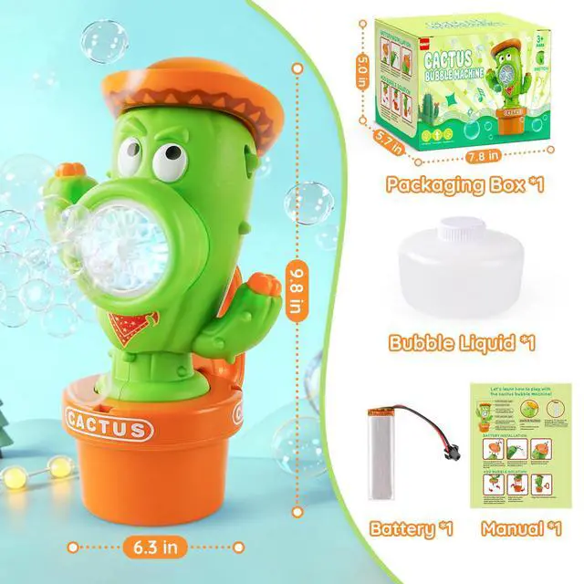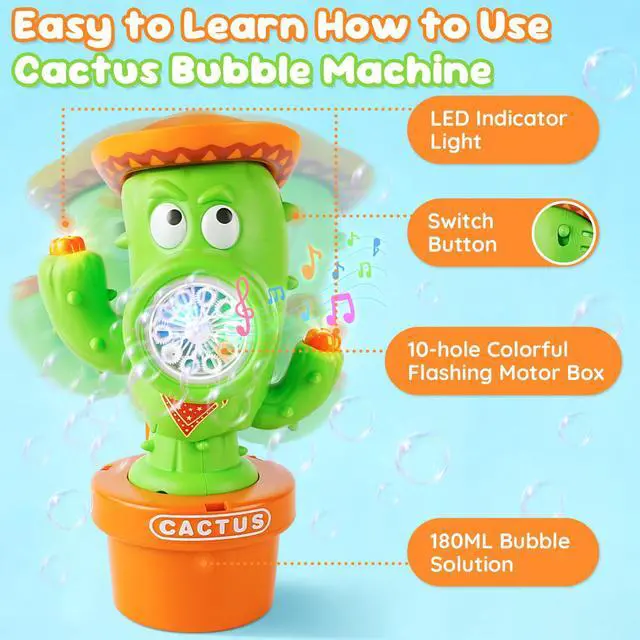 Dancing Cactus Bubble Machine with Music & LightsOur cactus bubble machine features a playful dancing wiggle action that syncs with upbeat music and colorful LED lights. As bubbles flow out, the cactus body sways back and forth, creating a magical, interactive show that captivates kids and toddlers aliketurning any moment into a lively, joyful celebration