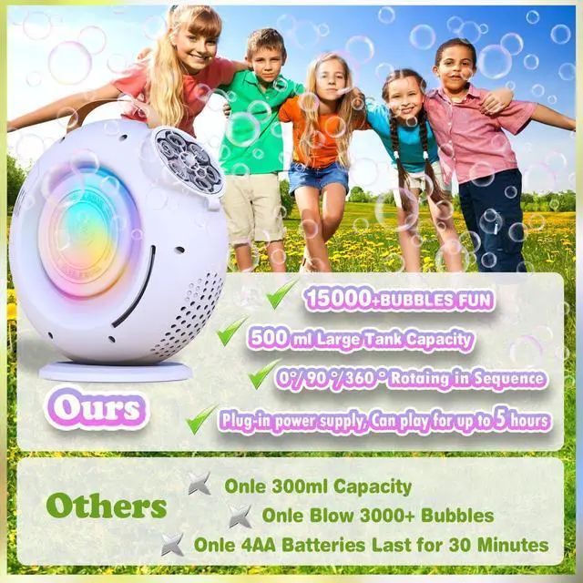 The duration of bubble solution depends on factors such as bubble capacity and battery settings.Normaly 500ml of bubble solution willats for about 45~50 minutes.It is recommended to keep extra bubble solution to extend play time.