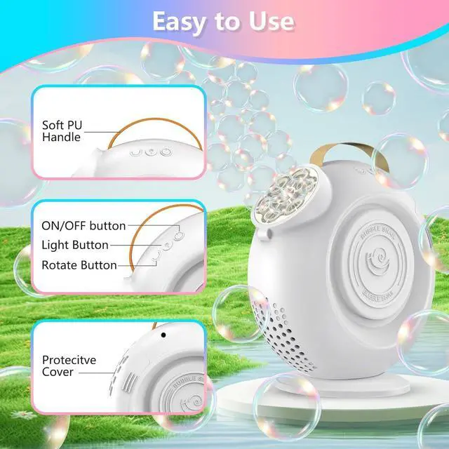 The bubble machine is easy to operate. Open the lid and add the bubble solution to the designated area, then press the power button.