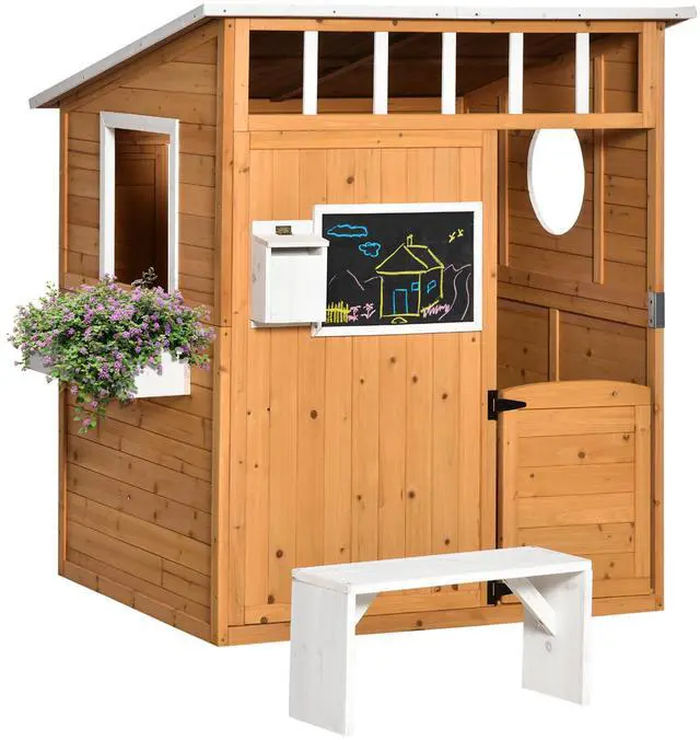 Kids Wooden Playhouse: Give your kids a place to play outside with this backyard playhouse. This outdoor playhouse includes a door, windows, mailbox, blackboard, bench, service station, and flowerpot holder.