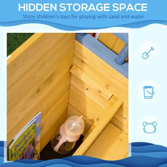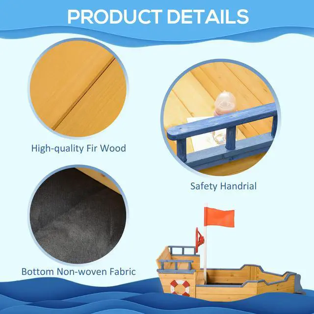 Wooden Play Boat: All aboard the kids'sandbox with a pirate ship design! This large sandbox lets your child play captain and pretend to steer the ship with the wheel, flag life ring, and more. Transform your backyard into a place where you kids can play and explore together.
