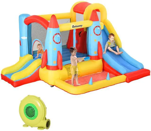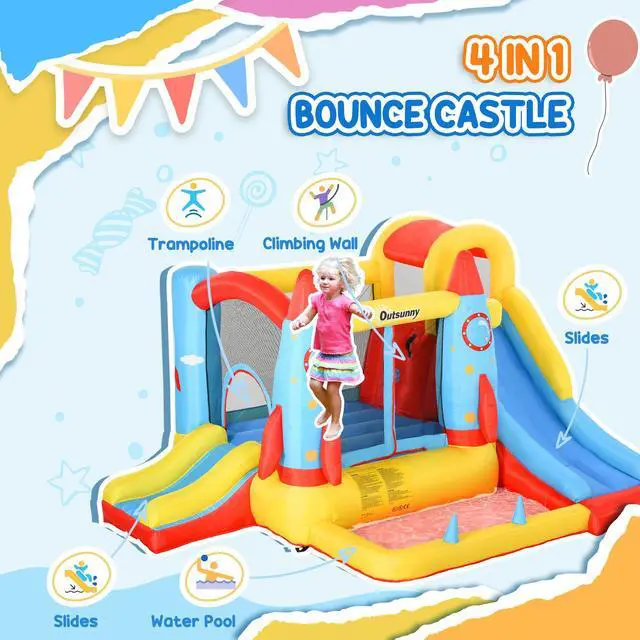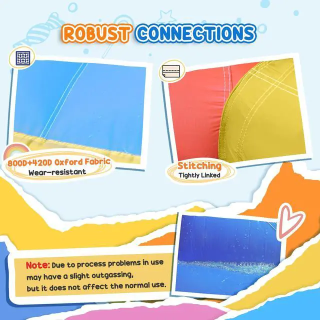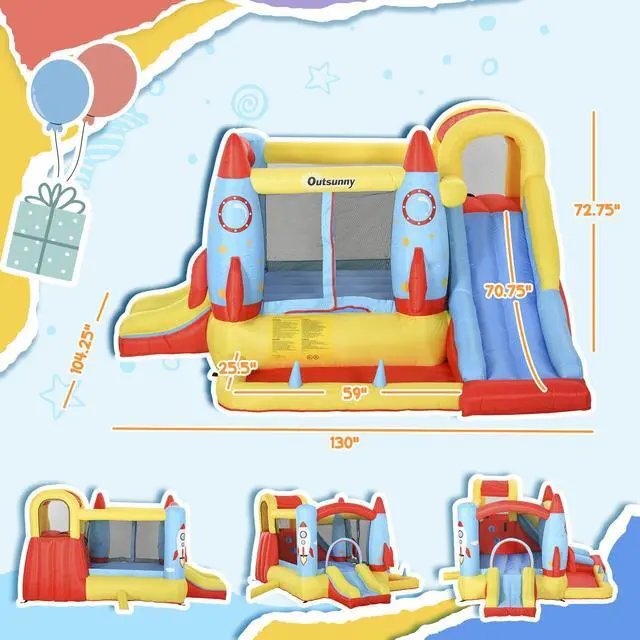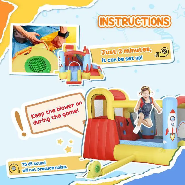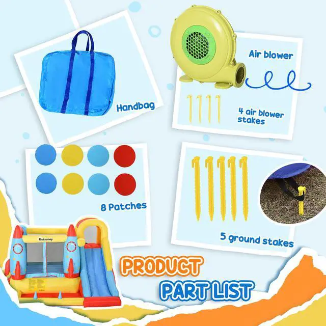 Secure: Keep your child safe and secure with they play! The inflatable bounce house includes 5 ground stakes to keep the structure stable, even on windy days. The 840D high-density oxford fabric can hold up in rain or shine and the slide area is big enough to accommodate 4 children at the same time. Includes 1 carry bag and 2 patches for easy transportation and repair.