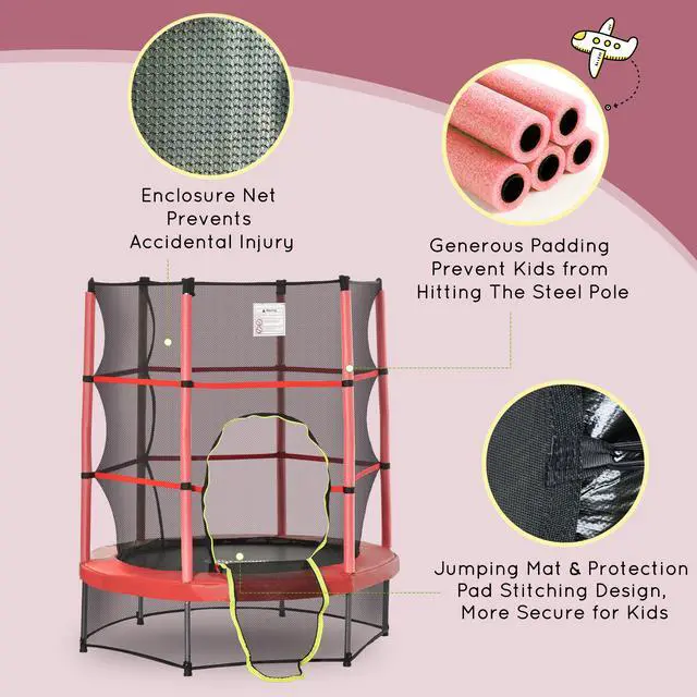 SAFETY FIRST: Comes with jumping mat, an enclosure net, and PVC covered metal post to prevent accidental injury and a convenient U shaped zippered door for easy in and out.