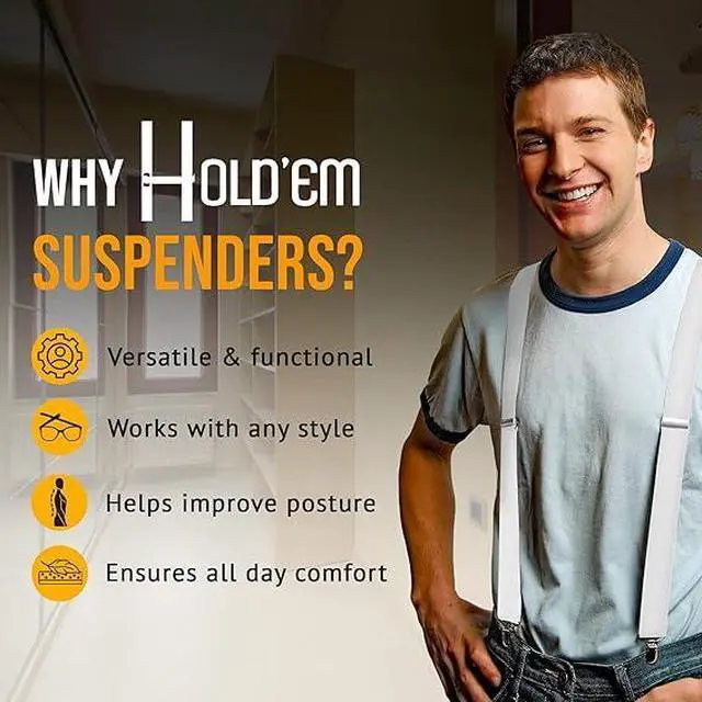 Keep your pants securely in place with the Adjustable X-Back Mens Suspenders from Hold'Em. Not to be confused with shirt holders for men, our stretchable and durable fashion accessories comfortably hold up your pants without requiring frequent readjustment.