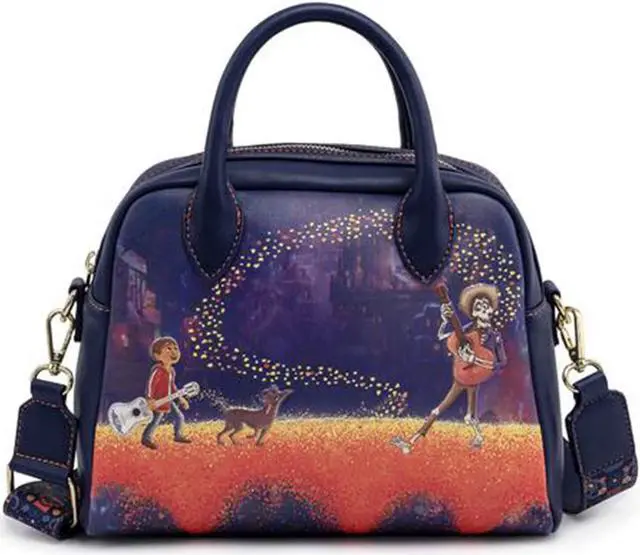 This is a Loungefly Pixar Coco Marigold Bridge Guitar Strap Crossbody Bag Purse. Loungefly is well known for making high quality products.