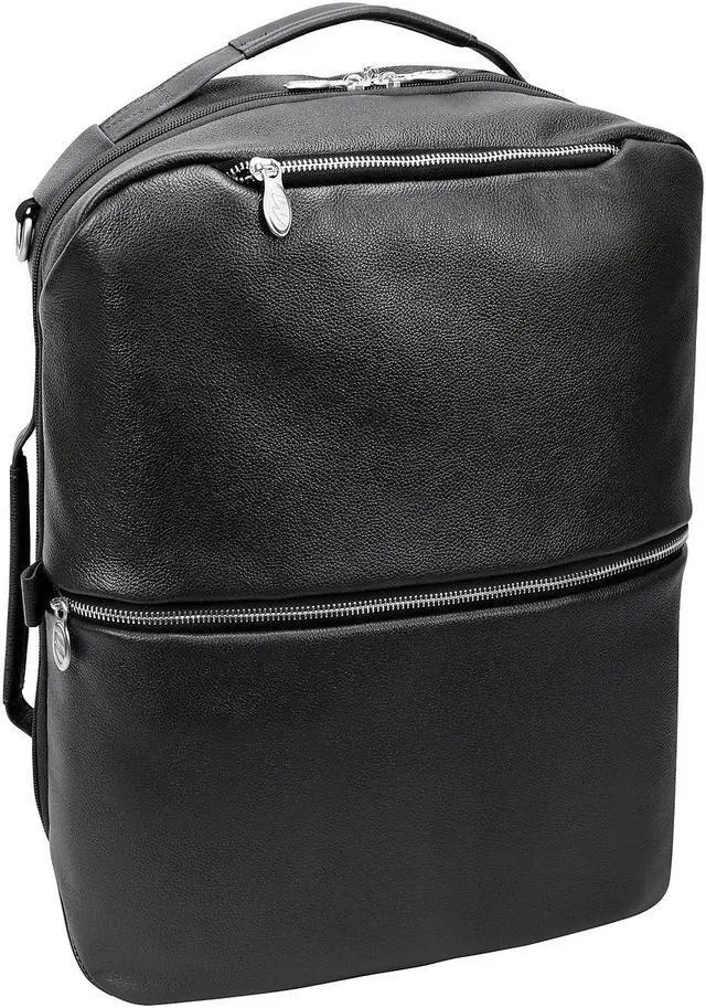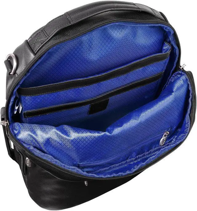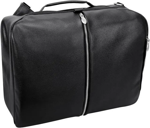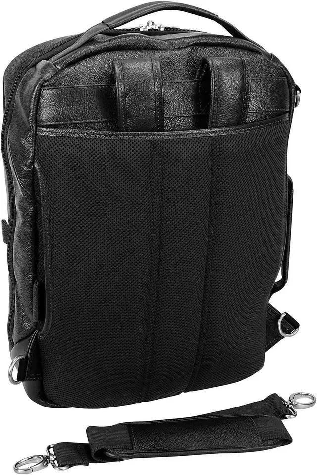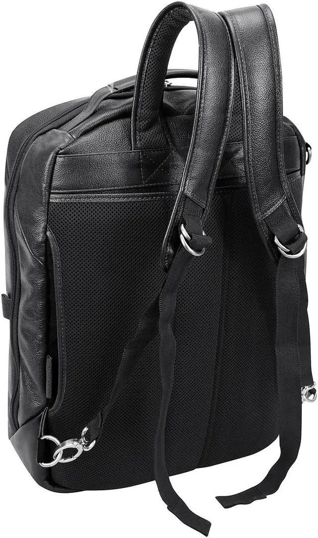 This versatile 17 Convertible travel backpack and messenger bag can carry you to your next trip fully prepared multiple options for the way you hand carry your essentials with top or side carrying handle. Keep your business items easily accessible in front horizontal zipper compartment with interior accessory organizer. Top pocket with exterior and interior access to store cellphones and keys. Safely store your important devices in our interior 17 Built in padded laptop sleeve or the secure tablet pocket. Storage has never been easier in our fully lined interior with Leather trim and silver hardware.