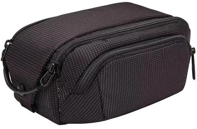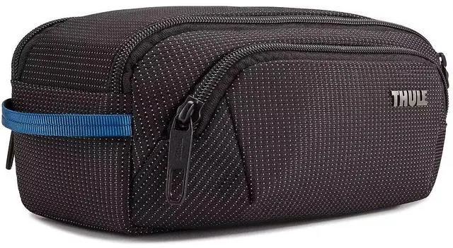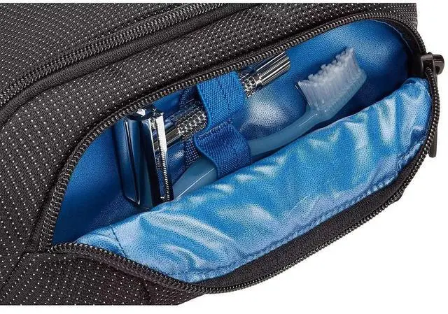Use this black Crossover 2 Toiletry Bag from Thule to carry and organize your toothbrush, razor, travel soaps, shampoos, and related toiletries. The bag has a zippered wide mouth design with two water-resistant pockets, assorted interior pockets, and a strap handle. Users will appreciate the strong and durable padded nylon construction.