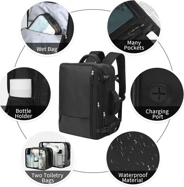 [Two Toiletry Bags]: comes with two toiletry bags to carry your hair and bath products, liquid hygiene or whatever you may need. The backpack also has a wet and dry compartment to keep your dirt clothes.