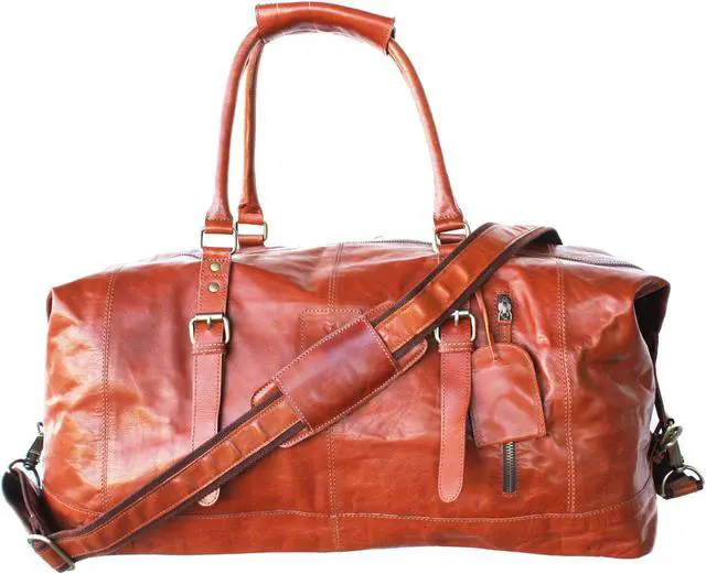 Lightweight slim bag made from soft full grain leather makes the perfect travel bag that will provide years of service. Features antique finish brass hardware, detachable nylon shoulder strap, and comes double stitched for durability. Easy to access front outer pocket let's you store small items such as phone, passport, wallet, and keys. Two leather handles to carry at waist level.