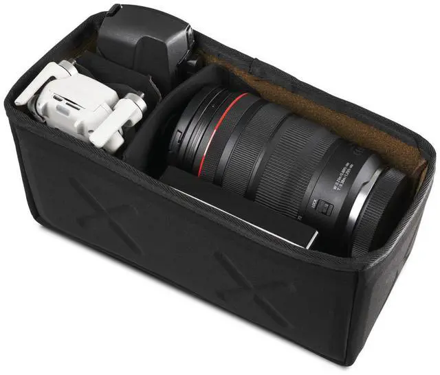 The dividers are hinged in the middle to give you multiple options for customization, so you can create the perfect camera gear set-up.