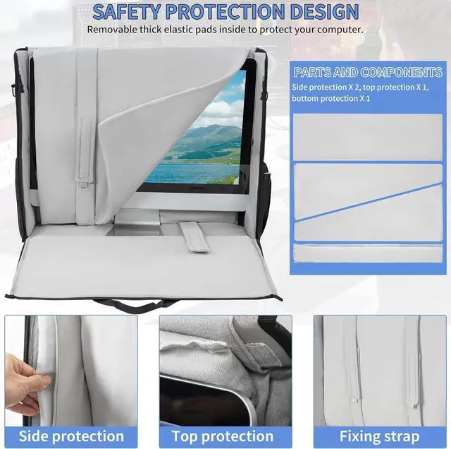 Rubber feet and PVC protection on bottom of bag. Removable adjustable carrying strap and padded handle let it more easier to carry your IMAC desktop computer everywhere. Great for the office to keep everything within reach or to make a mobile office to carry what you need on the go