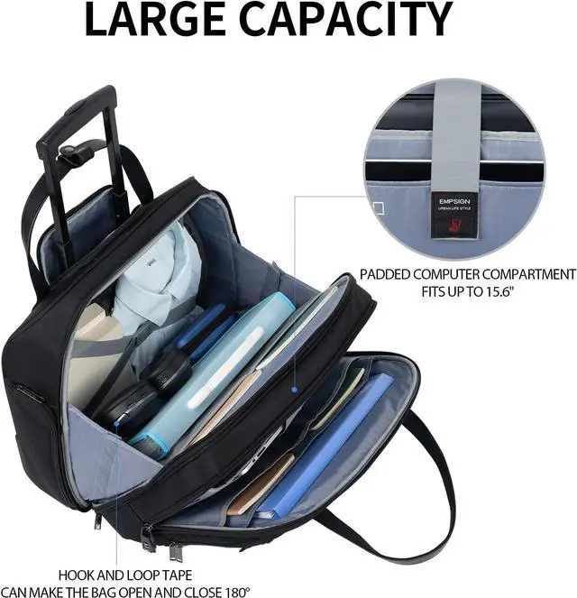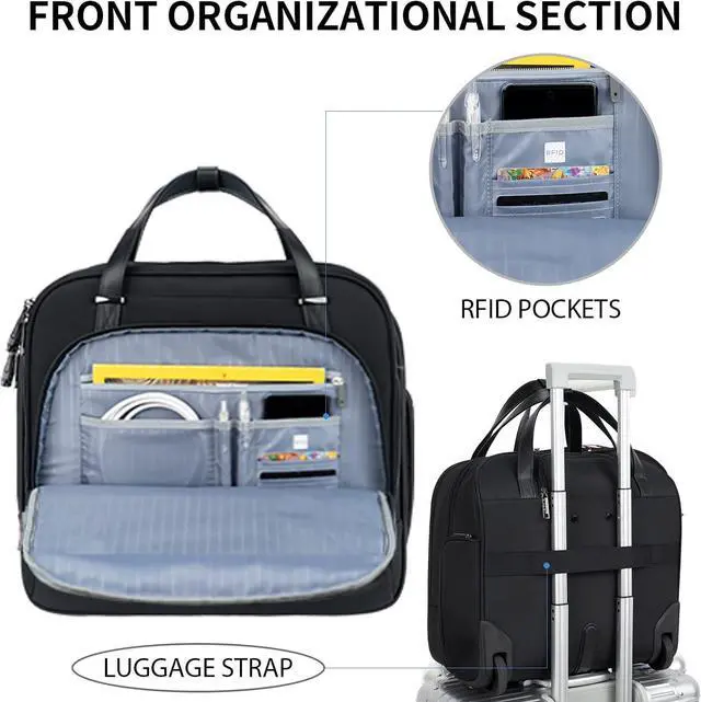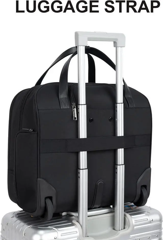 The rolling laptop case has a leather grip, smooth zippers and waterproof bottom corner guards; retractable aluminum push-button handle and 2 silent rubber wheels make the briefcase roll effortlessly and more maneuverable. In addition, the rolling bag is equipped with a trolley strap on the back to securely fasten the bag to your luggage, making travel more comfortable.