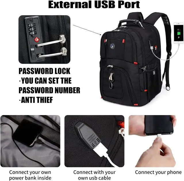 The external USB port with built-in charging cable provides convenience for charging phone. There is a password lock device to protect the security of the computer, and the backpack is equipped with a sturdy handle. Unfold the oversize backpack freely by 90-180 degrees, designed specifically for airplane travel. A large backpack is perfect for indoor/outdoor activities. A large laptop university bag that you can use anywhere for travel, camping, hiking, and trip