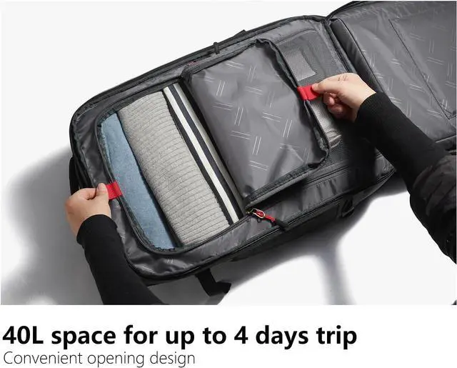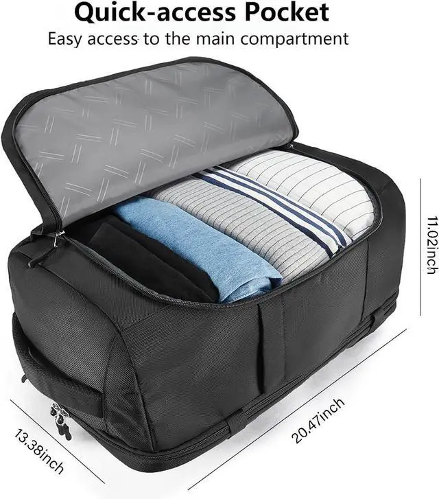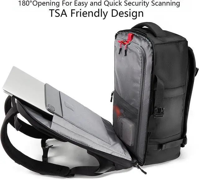 the main compartment can be unzipped like a suitcase for reach the main compartment from the quick access front pocket for easy reach of your travel essentials on the go, The tech compartment can accommodate up to 17" laptop and 12.9 inch iPad with accessories, Front pocket, top pocket and side pockets for easy access to Data cable, airpods and power bank, etc.