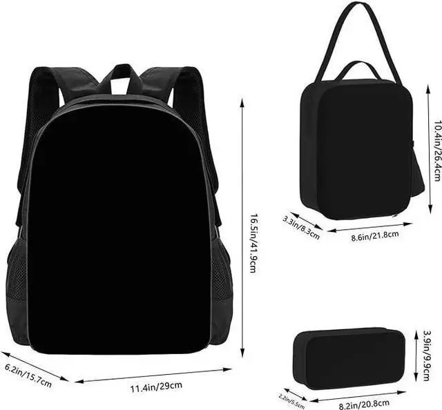 Material: Outer: High quality Durable water resistant eco-friendly Polyester fabric; Inner: Polyester lining. It offers high and long lasting performance and minimal weight. Fashion design & Vivid Printing, eye-catching and impressive, bring a good mood to kids to back to school. Combined purchase are more favorable. Dimensions:Backpack Approx dimensions: backpack: 11.8"L*15.7"H*6.2"W lunch bag size: 7.8"Lx9.4"Hx3.1"W Pen case size: 9"Lx4.3"Hx2.7"W Adjustable Shoulder Straps: You can adjust the length of the shoulder straps to suit your ideal comfort. Storage: Perfect for your laptop, charger, books, clothes, snacks, wallet, pencil case, bag, textbook, notebook, etc Material: 300D Oxford cloth Material description: Textured Oxford cloth is preferred, with a comfortable touch, good gloss, easy care, clear texture, fine luster, and strong sense of design lines. Upper body effect: a backpack that makes your travel easier and more fashionable. It integrates leisure, comfort and multi-function, and this bag is also waterproof, scratch-resistant and wear-resistant, releasing a slow fashion atmosphere. Function description: layered storage, layered division makes storage more convenient Special note: due to different measurement methods, this size data is normal, and the error is within 2-4cm Applicable people/scenes: school, travel, hiking, training courses, shopping, zoo, park, outdoor sports, etc., unisex. It is also a perfect gift for kids and friends.