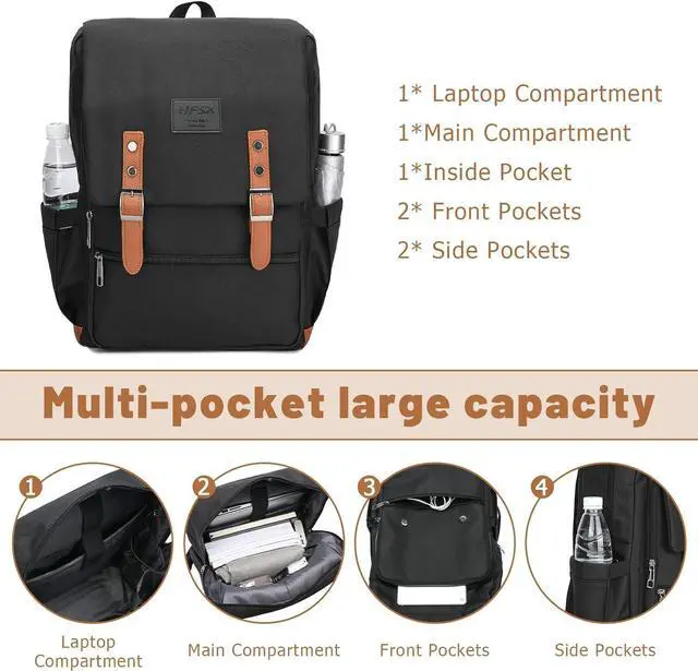 Large Storage SpaceOne separate laptop compartment hold 15.6 Inch Laptop as well as 15 Inch, 14 Inch and 13 Inch Macbook/Laptop. One spacious front compartment roomy for daily necessities, tech electronics accessories. main compartment with many pockets, pen pockets, make your items organized and easier to find