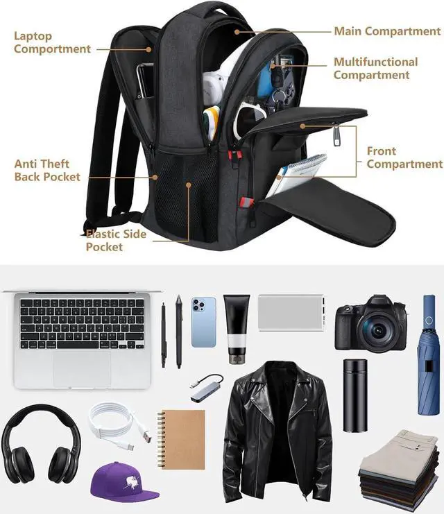 Large Capacity & Multi-PocketsThe separate laptop compartment is suitable for 15.6 /15/14/13 inch Macbook/Laptops. The spacious main compartment can hold books, clothes for 1-2 days, chargers, headphones, and other daily necessities. The front compartment has many pockets, pencil cases, and key hooks to neatly store various small items. The elastic side pockets are convenient for carrying water bottles and umbrellas. Whether for work, leisure, or travel, it can meet your storage needs.