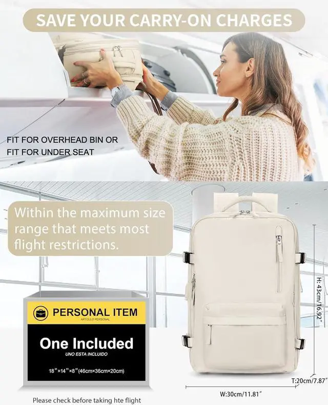 Backpack For Women: The size of backpack is 11.81 * 7.87 * 16.92 (inch) Travel backpack for women airline approved that can be carried in flight, it saves you a fortune on checked fees and is perfect for traveling or on business trips under the seat on the plane.