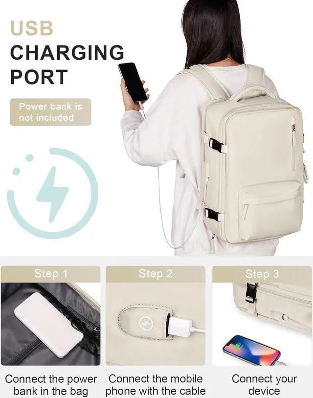 Laptop backpack USB interfaceWith external built-in USB charger and internal built-in charging cable, this USB backpack provides you a more convenient way to charge your phone, ipad and laptop. Please note that this backpack does not include the power bank itself, the USB charging port only provides convenient charging.
