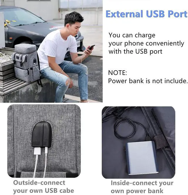 USB & HEADPHONE PORT DESIGN: With a USB charging port and headphone jack extended on the side of the backpack and built-in charging cable and headphone cable inside, provides convenience to charge your phone and listen music while travel walking work. Please noted this backpack doesn' t equipped power bank.