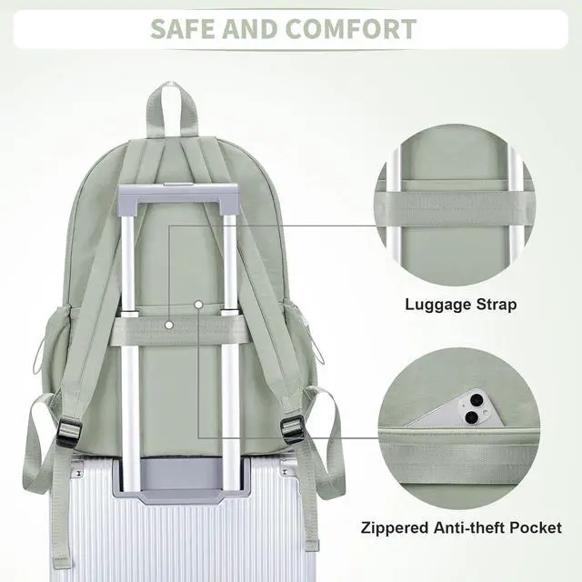 The small zippered pocket on the front of the backpack is convenient for storing personal items, while adjustable pockets on both sides facilitate securing various-sized water bottles to prevent them from falling. The college backpack is designed with an anti-theft zippered pocket for better security of belongings. Additionally, it is equipped with a luggage strap that can be attached to a rolling suitcase, making your travels more convenient and effortless.