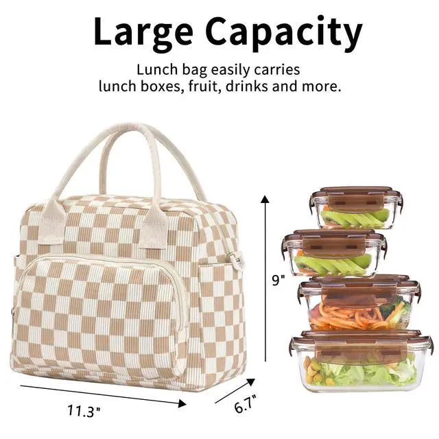 Large CapacityLunch box for women measures 11.3"(L)*6.7"(W)*7.9"(H), lunch bag including a zipper main compartment to keep food fruits warm and fresh, two side pockets for water bottles and drinks, front zipper insulated pocket for snacks or utensils, an open pocket on the back for cell phones and other items that need to be easily accessible. Multiple pockets allow you to keep your belongings organized.