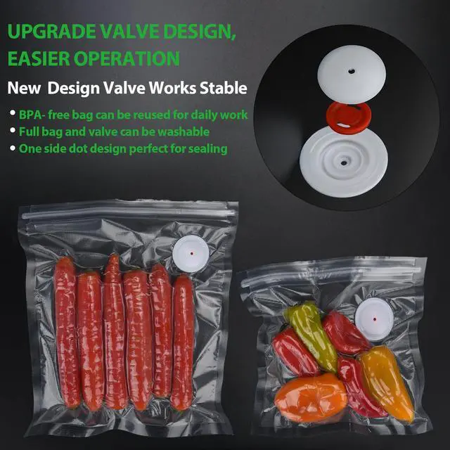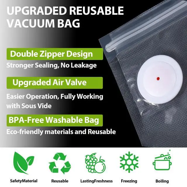 High Quality Food Vacuum Bag---Heavy Duty, Puncture prevention design from piercing of Bones, Double Zipper, no leakage. Upgrade Air valve freely to used in sous vide machines. Single-sided embossed dotted surface increases suction for better air evacuation and sealing.