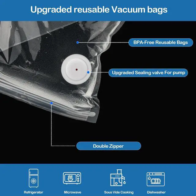 40PCS reusable vacuum bags, 20PCS large size bags 13.4*10.2 inches and 20PCS small size bags 8.3*8.7 inches, to meet the needs of various kitchen food vacuum storage.