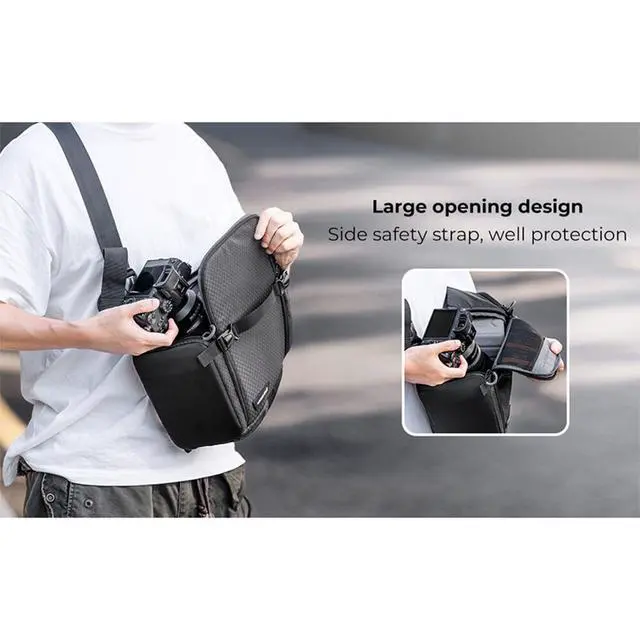 Enhance your photography experience with our 10L Camera Sling Bag, specifically designed for DSLR/SLR cameras. With dimensions of 16 x 8 x 6 inches (L x W x H), this robust bag offers ample space for your camera, phone, accessories, and personal items, making it an ideal companion for travel and outdoor adventures. This Camera Sling Bag features a unique side safety buckle that securely holds your camera, preventing it from falling out. The side opening design provides quick and safe access to your equipment, while the soft foam layer offers superior protection against accidental shocks and scratches.