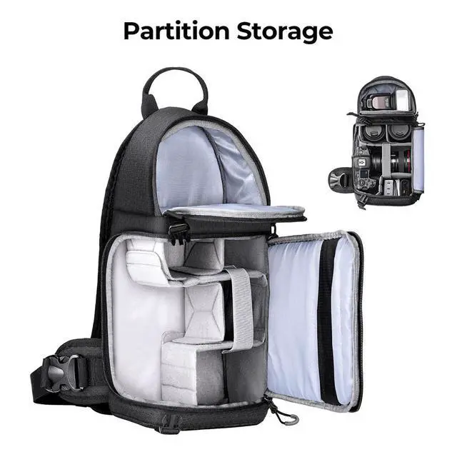 Despite its slim profile, this bag boasts a large lower storage case with removable modular inserts, allowing you to customize the space to fit various lenses and flash units. The upper compartment is perfect for storing essential accessories. A tripod holder is conveniently located on one side of the bag for easy access. The flexible shoulder strap can be adjusted from 20.8 to a maximum of 40 inches, making it suitable for both men and women. The sling design allows for quick access to your camera, making it a favorite among camera enthusiasts.