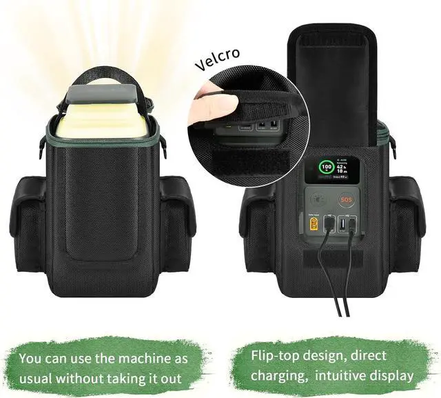 Convenient Flip Design: Power bank 192wh camping bag features a front flip design equipped with a built-in barrier. Users can conveniently open the flip cover and directly charge devices without need to remove them from the bag. This bag offers convenience for anker power bank equipped with a lighting function on the lid. When the up lid is opened, it provides illumination, eliminating the need to remove the power bank from the bag to use it as a flashlight.
