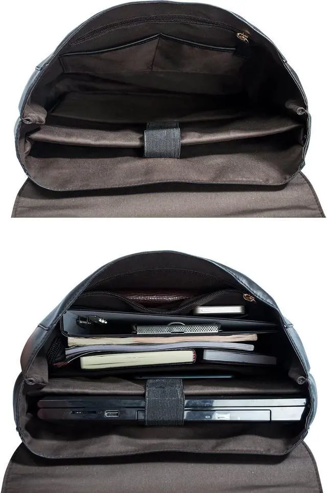 This satchel backpack has total 7 compartments. 1 front pockets that hidden by the front flap. 2 main compartments: 15.6 inch computer compartments, iPad pocket and the other compartment. 2 open pockets and 1 zipper closed pocket which is in the front wall of the main compartment. 1 rear zipper closed small security pocket that hold your value goods.
