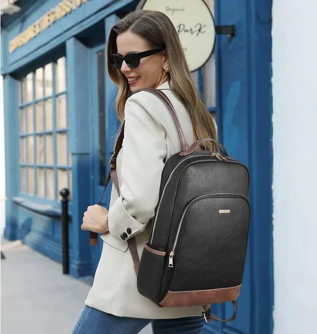 Features: This laptop backpack for women is equipped with a luggage strap which helps to free your hand and back, will make your travelling and business trips more convenient. Simple color matching, vintage, fashionable and durable. The leather backpack has a large capacity, suitable for work, shopping, travel, etc.