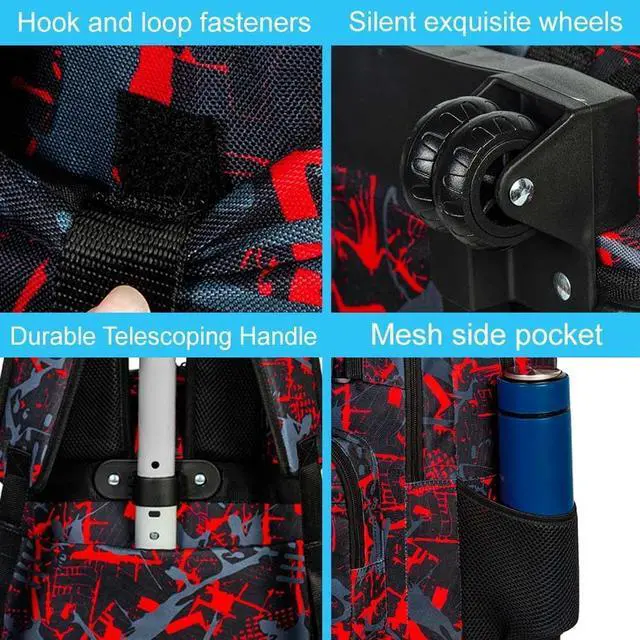 Large Capacity: The rolling backpack for boys has 2 large independent compartments for laptops, ipad, books, and 3 front zippered pockets for tissues, keys, computer hard drive, etc.