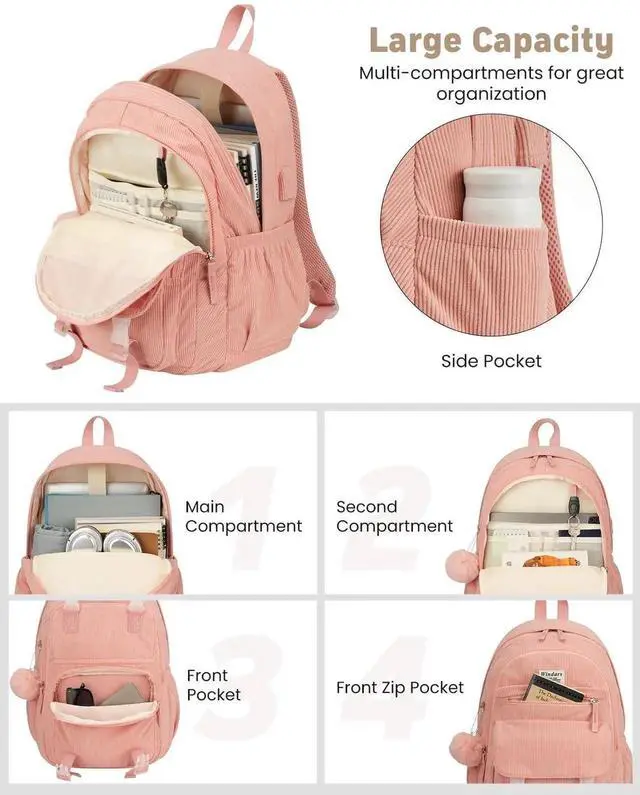 This school bag has a roomy main compartment, which can carry all of your textbooks, lunch, anything you need, especially the compartment for large laptop. The front compartment can put your pens, keys, mouse, small notebook. 2 front pockets is perfect for storing stationery box, cutlery box, etc. The two side pockets can put a water bottle, umbrella. Its easy to keep everything organized.