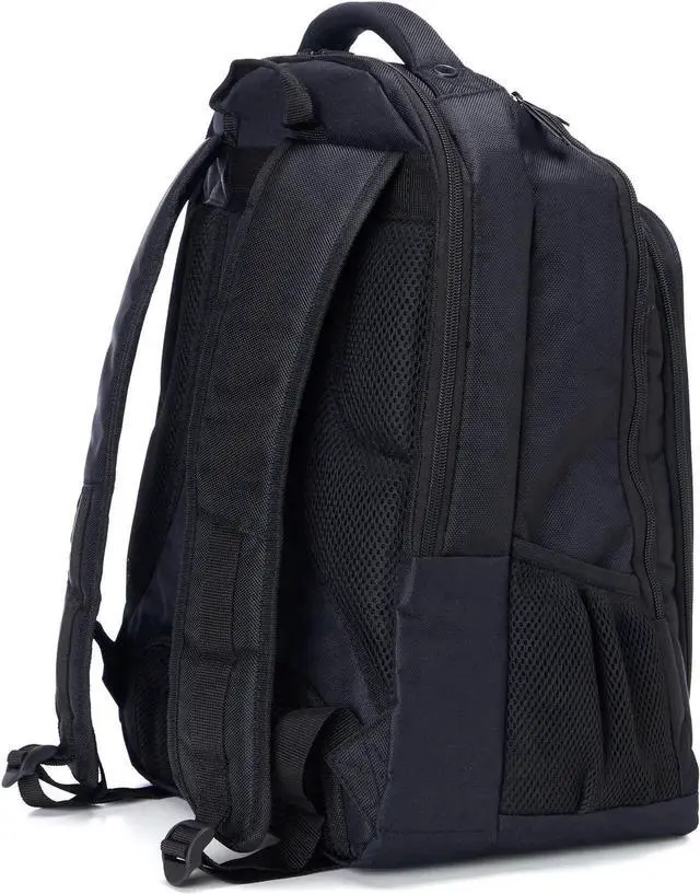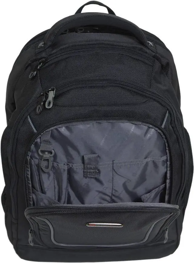 Oneida Laptop Backpack By Alpine Swiss Product Features: Ballistic Polyester 2021 DESIGN UPGRADE The Alpine Swiss Oneida tech backpack has been upgraded with updated design features and reinforced construction. This backpack measures 18.5 x 15 x 8 inches and is the perfect College or travel companion to carry all of your essential belongings. DEDICATED TECH POCKETS Main compartment is spacious and features a designated padded laptop sleeve and a tablet pocket with a secure elastic strap. The second compartment is also spacious and has an additional mesh zipper pouch to easily see and find your items. SMART ORGANIZATION Front zip pouch organizer with a key holder, 2 pen pockets, and 2 slip pouches. Easy access zip pouch under the carrying top handle is perfect for sunglasses. Two elastic side mesh pockets ideal for a small water bottle. TRAVEL Padded air mesh back panels and adjustable padded air mesh comfort straps provide breathability and comfort while traveling. Backpack when empty is lightweight 2 lb 4 oz and has a convenient padded top carrying handle. QUALITY MATERIALS Crafted from durable ballistic polyester that looks sleek and professional. The zippers are smooth and durable, with matte black metal pull tabs with engraved alpine swiss logo.