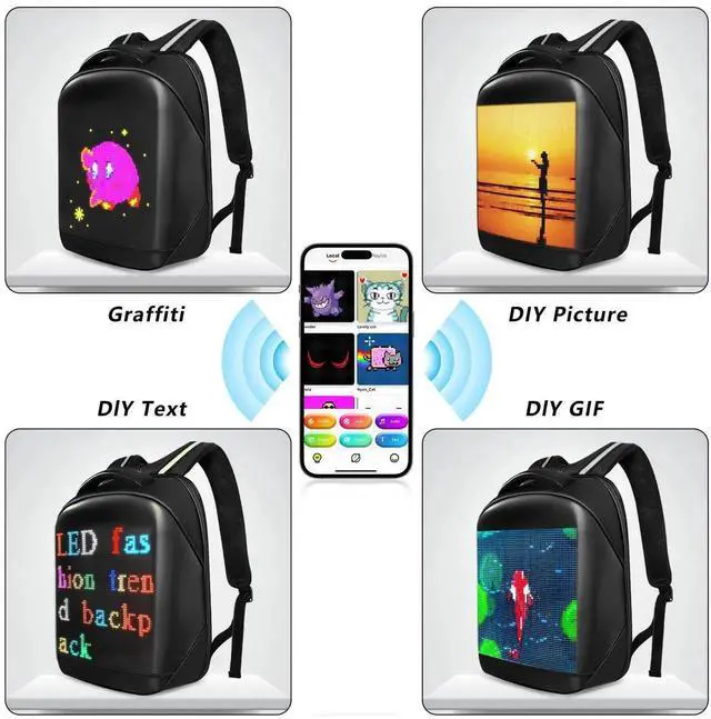 Control by our APP -- iledColor app can be used with this Led backpack. You can change all settings through the app, add your custom pixel arts, photo or download other artworks/animations. The app is compatible with IOS and Android systems and is free to download from Google Store or APP Store.